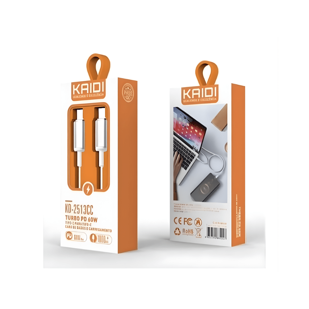 O Cabo USB-C para USB-C Kaidi KD-2513CC foi desenvolvido para oferecer carregamento rápido, seguro e eficiente em dispositivos compatíveis com tecnologia Power Delivery. Com potência de até 60W, garante alta performance para smartphones, tablets, notebooks e outros aparelhos com entrada USB-C.