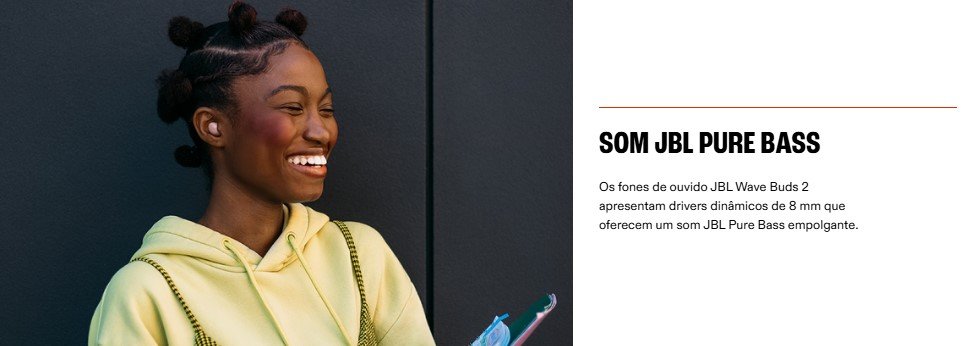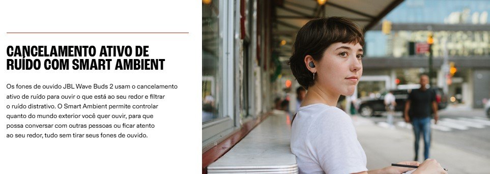 O JBL Wave Buds 2 oferece som imersivo, conforto e tecnologia avançada para o seu dia a dia. Equipado com cancelamento ativo de ruído (ANC) e modo ambiente (Smart Ambient), permite escolher entre se desligar do mundo ou manter a percepção ao redor. Com o som JBL Pure Bass, proporciona graves potentes e áudio equilibrado para suas músicas, chamadas e vídeos.