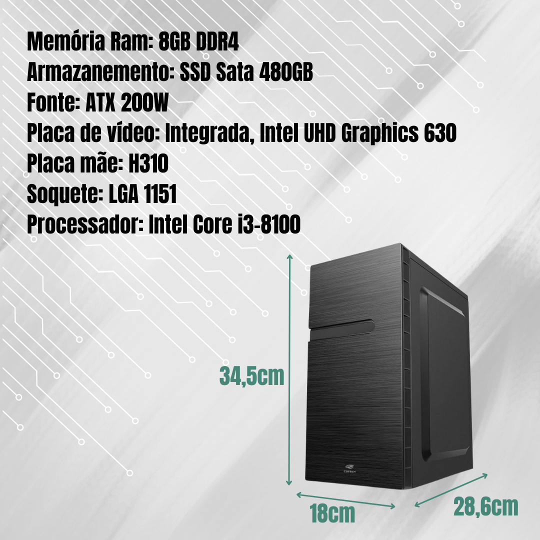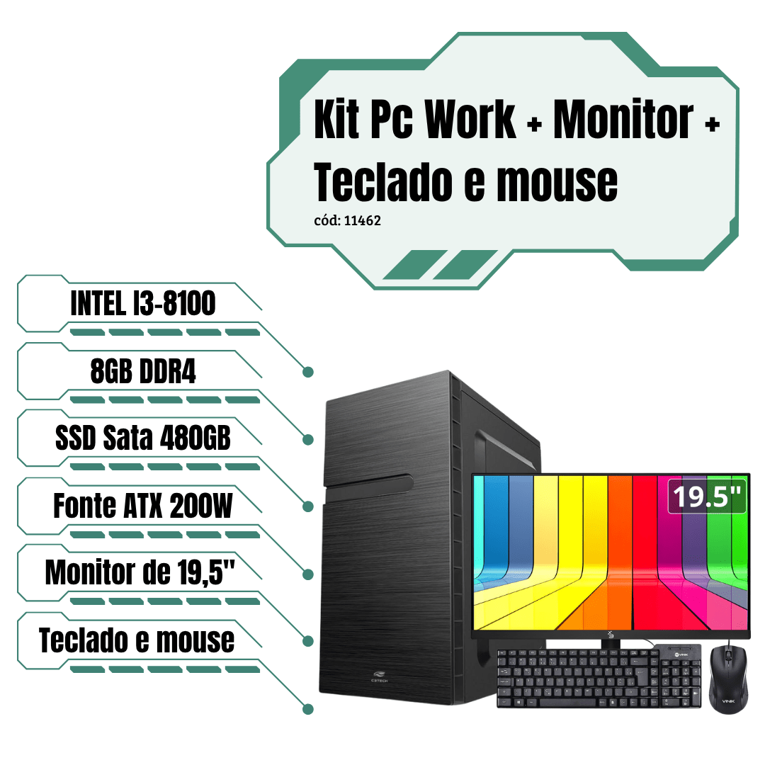 Kit PC Work Intel i3-8100, H310, 8GB DDR4, SSD 480GB, ATX 200W, Teclado, Mouse, Monitor LED 19,5" HDMI