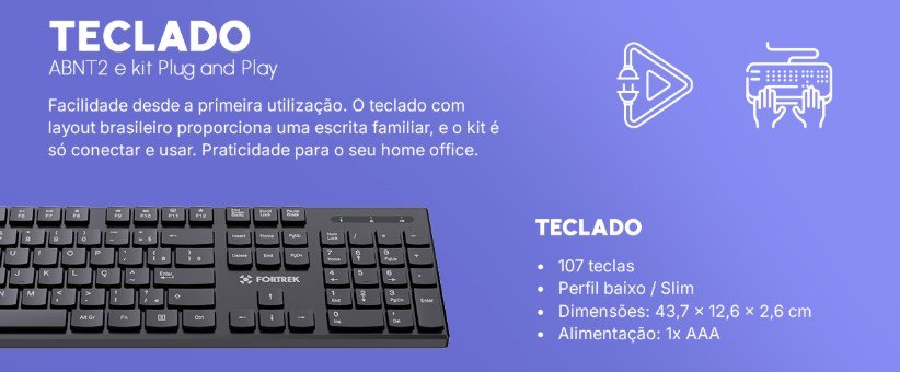 O kit teclado e mouse sem fio Fortrek Office CW11 foi desenvolvido para oferecer praticidade e conforto no uso diário, seja em ambientes de trabalho ou estudo. Com conexão estável via tecnologia sem fio 2.4 GHz, garante liberdade de movimento e facilidade de instalação, sem a necessidade de cabos.