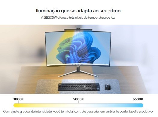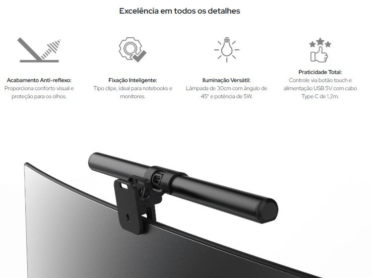 Seu design em barra permite iluminar apenas a área de trabalho sem gerar reflexos na tela, mantendo a visualização limpa e confortável.