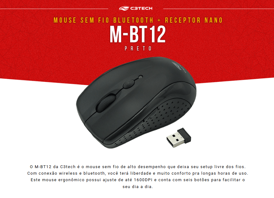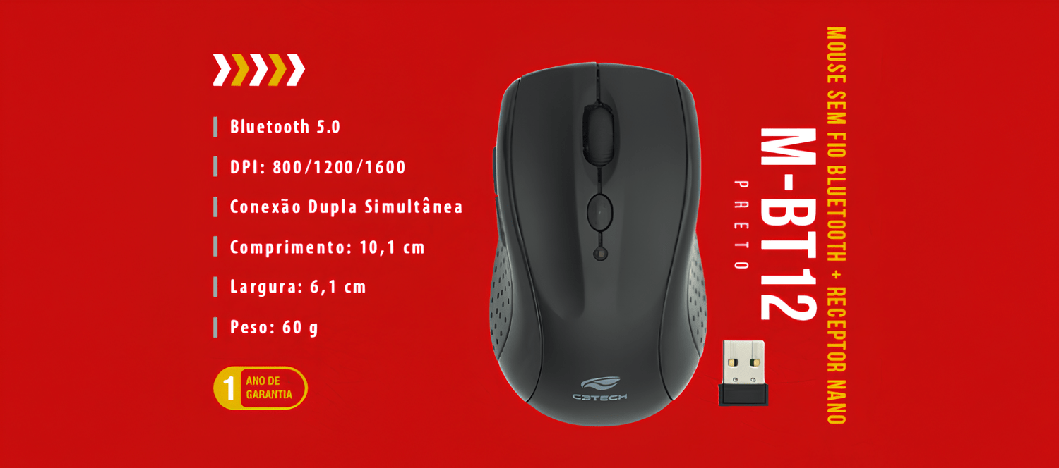 O Mouse M-BT12 da C3Tech é a escolha ideal para quem busca conforto, desempenho e versatilidade. Com conexão dupla — Wireless 2.4GHz e Bluetooth —, você terá a liberdade para usar em diferentes dispositivos e ambientes, sem a preocupação com fios.