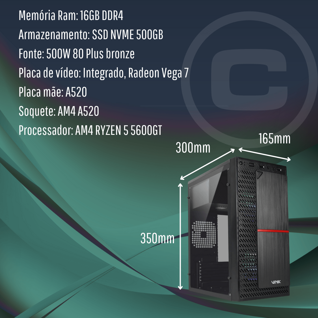 PC Gamer Plate AM4 Ryzen 5 5600GT, Radeon Vega 7, 16GB DDR4, SSD NVME 500GB, 500W 80 Plus