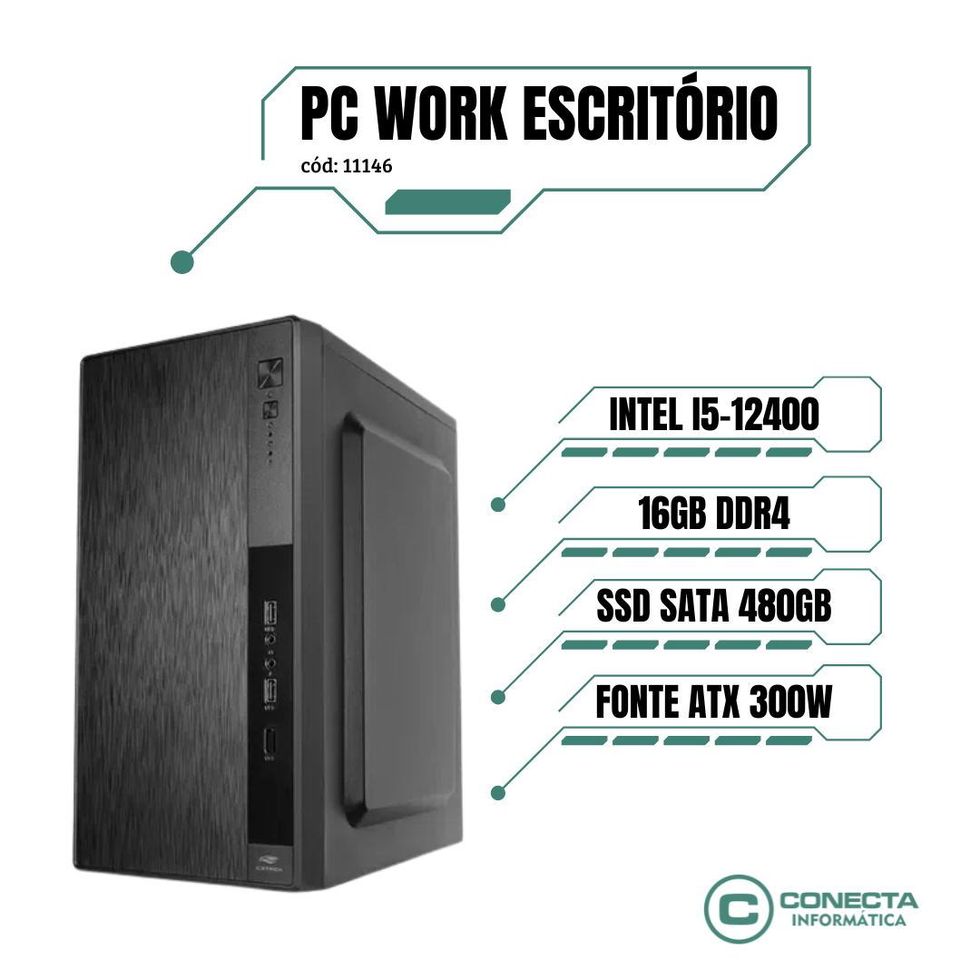 PC Work Intel i5-12400, H610, 16GB DDR4, SSD 480GB, Fonte 300W PFC Ativo