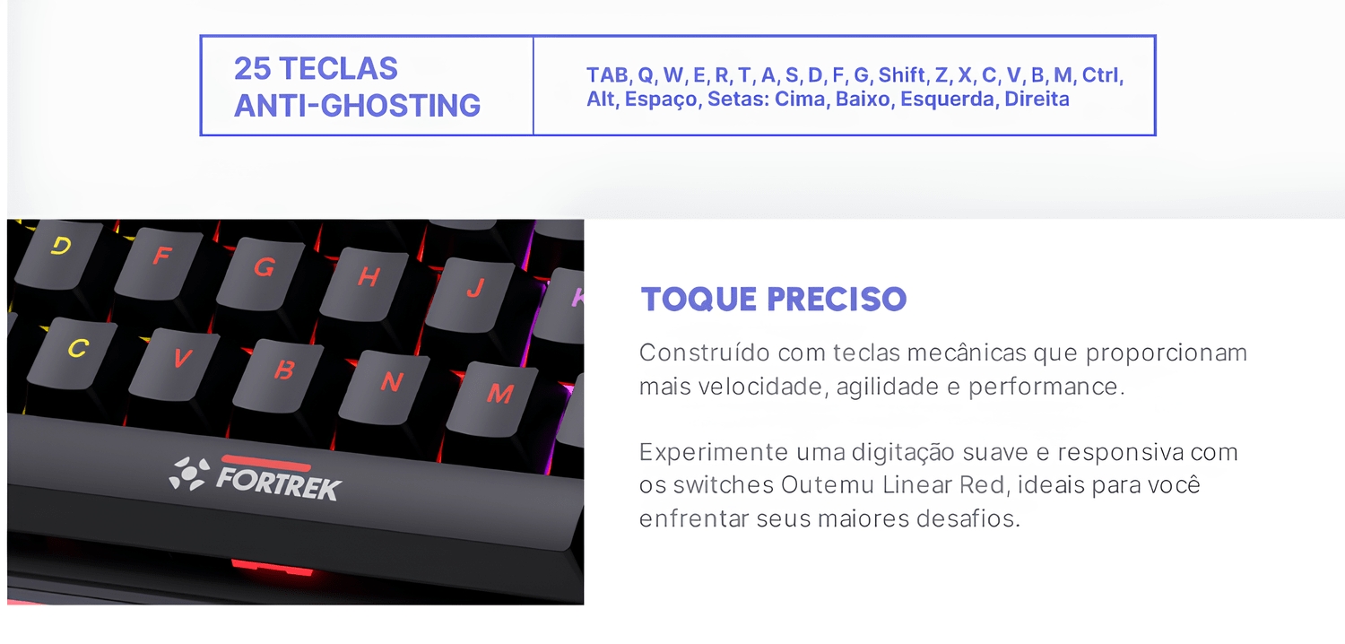- Número de teclas: 89, com 25 teclas anti-ghosting para garantir precisão nos comandos.
